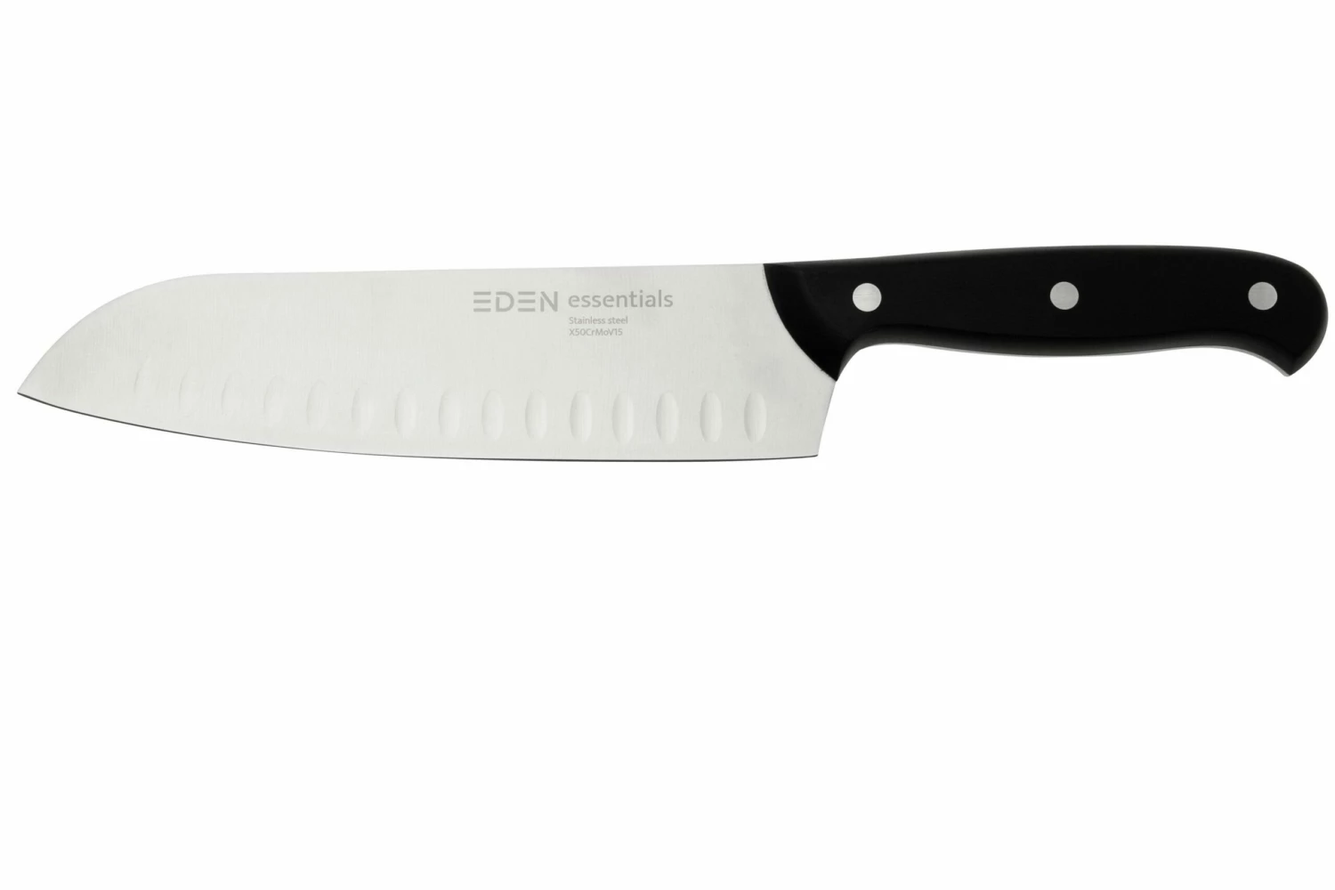 Das Eden Essentials-Santokumesser ist ein Kochmesser aus Japan. In Japen wird das Messer oft zur Zubereitung von Sushi verwendet. Auffällig sind die Grübchen in der Klinge. Diese sorgen dafür, dass die Zutaten nicht haften bleiben. Besonders beim Schneiden von Scheiben profitierst Du von diesem Antihaft-Effekt. Dieses Messer sollte auf keinen Fall in Deiner Küche fehlen.