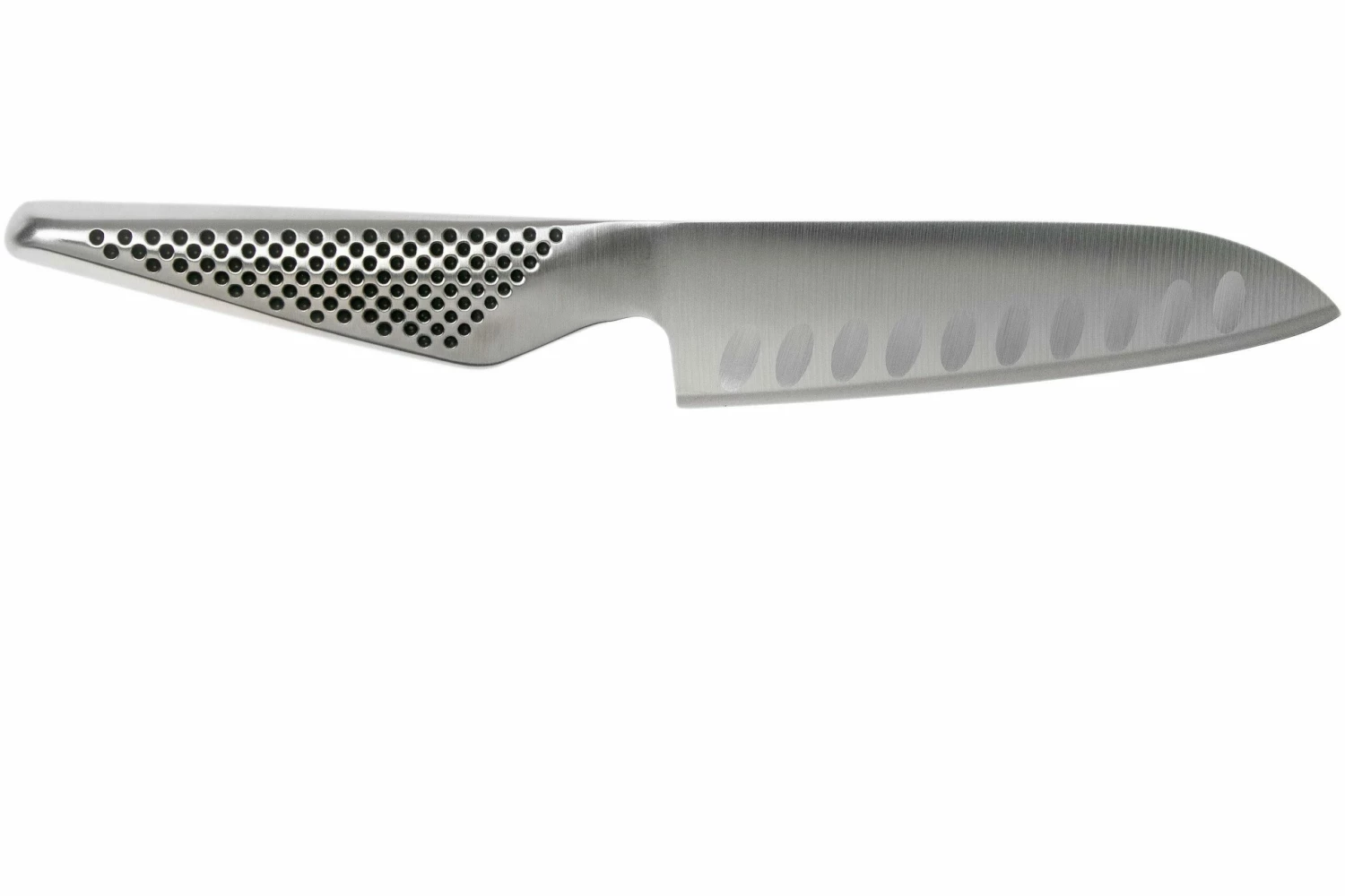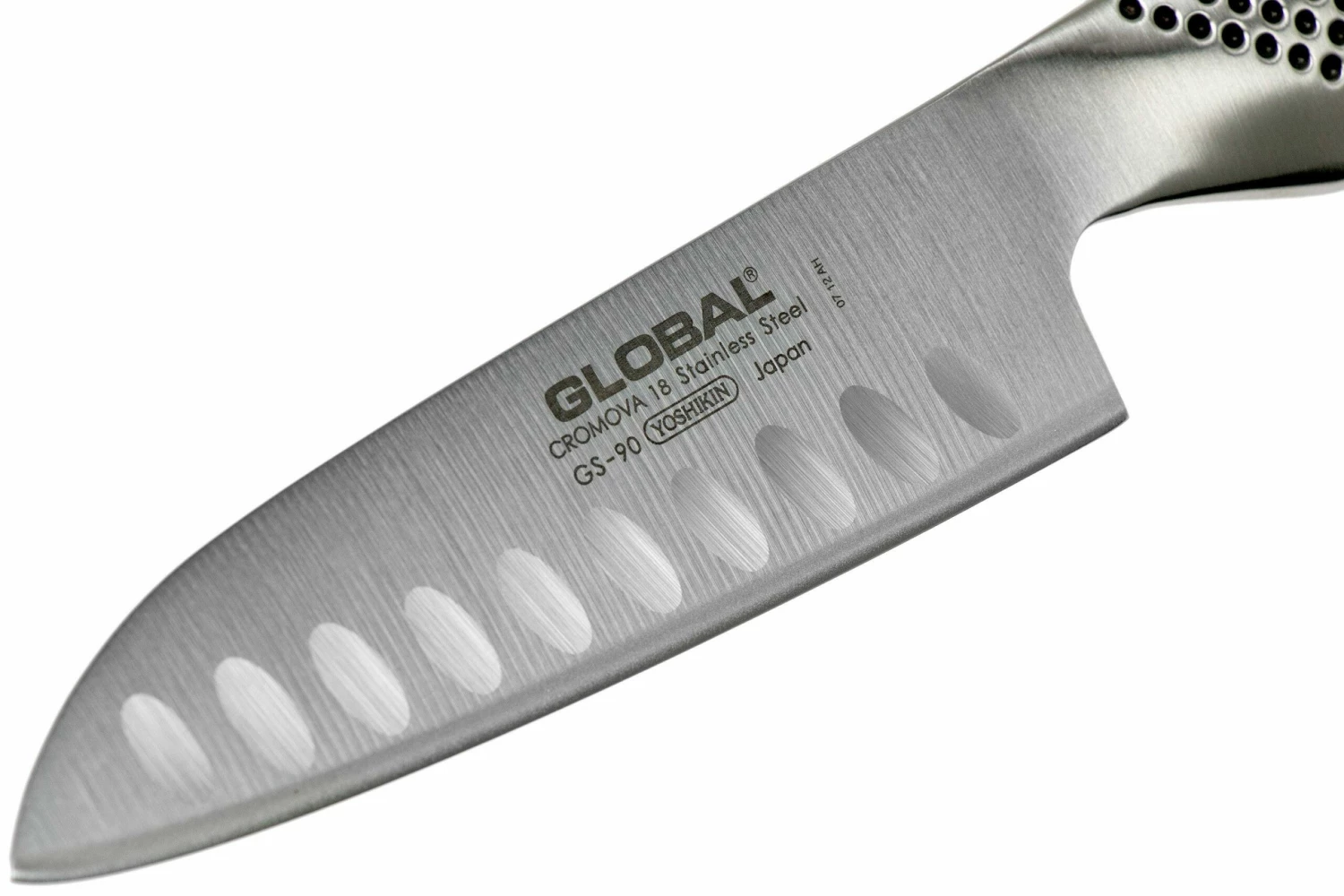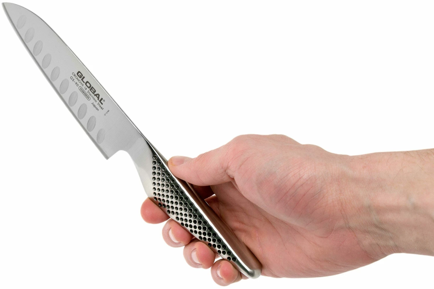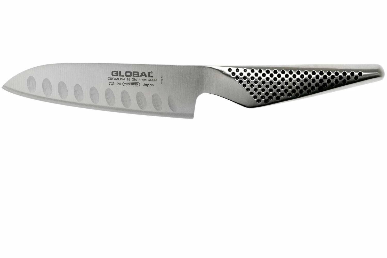 Das Global GS-90 Santoku ist der Nachfolger des GS-37. Der einzige Unterschied zwischen diesen beiden Messern sind die Kullen, die jetzt horizontal und nicht mehr vertikal sind. Da Du nun in Richtung der Kullen schneidest bleibt das Schnittgut noch weniger am Messer kleben.