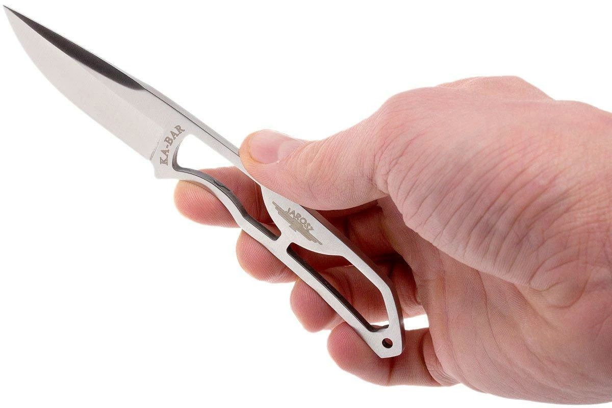 Das KA-BAR Jarosz Rambler Skeleton ist das Ergebnis der erfolgreichen Zusammenarbeit zwischen dem Messerdesigner Jesse Jaroez und dem Messerhersteller KA-BAR. Das Messer ist sehr kompakt und außergewöhnlich leicht. Es ist ein Messer, das Du leicht tragen kannst, ohne dass es im Weg ist oder einschüchternd wirkt. Das Messer lässt sich in der Scheide bequem als Halsmesser tragen.
