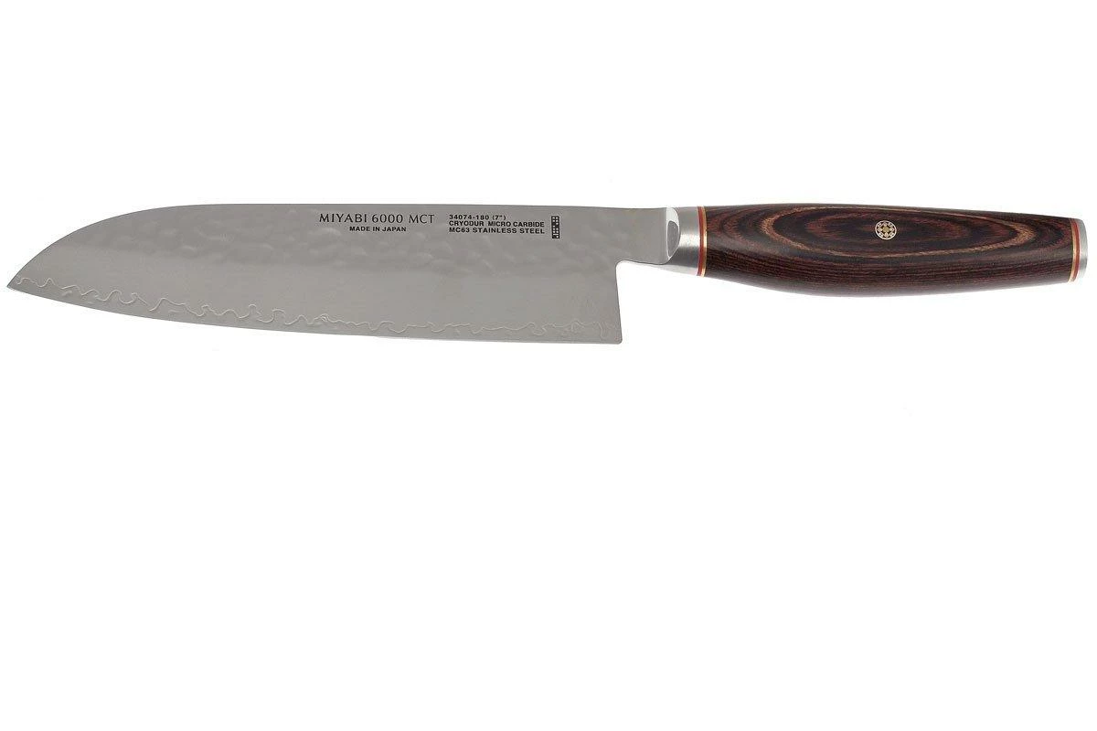 Im Klingen- und Griffdesign der Serie Miyabi 6000MCT gehen einzigartige Ästhetik und höchste Funktionalität eine vollendete Symbiose ein. Der Klingenkern aus extrem hartem MicroCarbide Pulverstahl MC63 ist von zwei weiteren Stahllagen umgeben, die einer Hammerschlag-Behandlung (Tsuchime-Look) unterzogen werden. Das spezielle Härteverfahren und der Honbazuke-Abzug verleihen der Klinge ihre enorme Schärfe von 63 Rockwell. Die CRYODUR-Klinge wurde in einem speziell entwickelten Verfahren gehärtet, das für die extrem hohe Härte sorgt. Der gebogene Griff aus formstabilem Cocobolo Pakka Wood sorgt dafür, dass das Messer angenehm und sicher in der Hand liegt. Ein Mosaik-Pin, die dunkle Holz-Optik und die dekorative Endkappe betonen den edlen Look.
