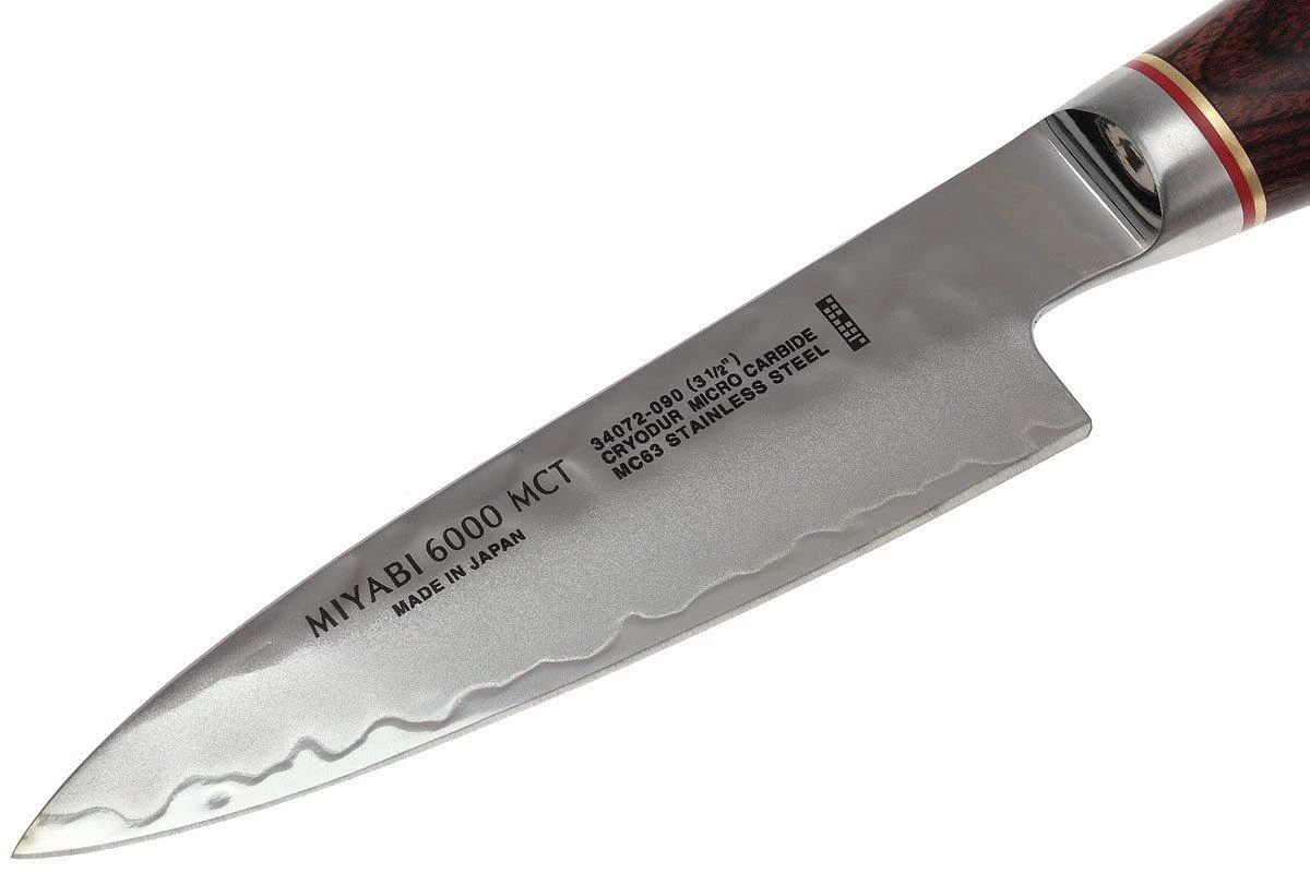 Im Klingen- und Griffdesign der Serie Miyabi 6000MCT gehen einzigartige Ästhetik und höchste Funktionalität eine vollendete Symbiose ein. Der Klingenkern aus extrem hartem MicroCarbide Pulverstahl MC63 ist von zwei weiteren Stahllagen umgeben, die einer Hammerschlag-Behandlung (Tsuchime-Look) unterzogen werden. Das spezielle Härteverfahren und der Honbazuke-Abzug verleihen der Klinge ihre enorme Schärfe von 63 Rockwell. Die CRYODUR-Klinge wurde in einem speziell entwickelten Verfahren gehärtet, das für die extrem hohe Härte sorgt. Der gebogene Griff aus formstabilem Cocobolo Pakka Wood sorgt dafür, dass das Messer angenehm und sicher in der Hand liegt. Ein Mosaik-Pin, die dunkle Holz-Optik und die dekorative Endkappe betonen den edlen Look.