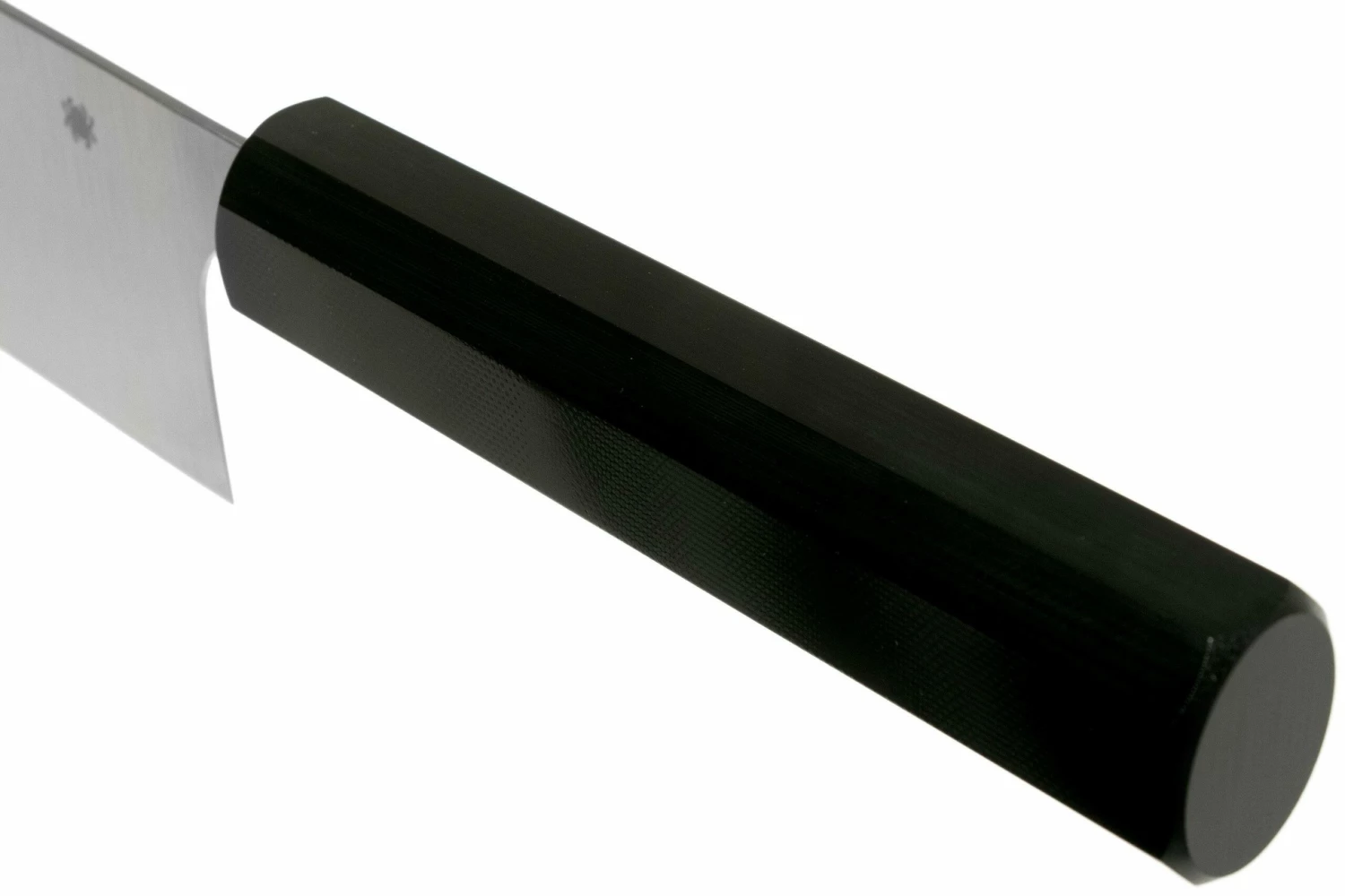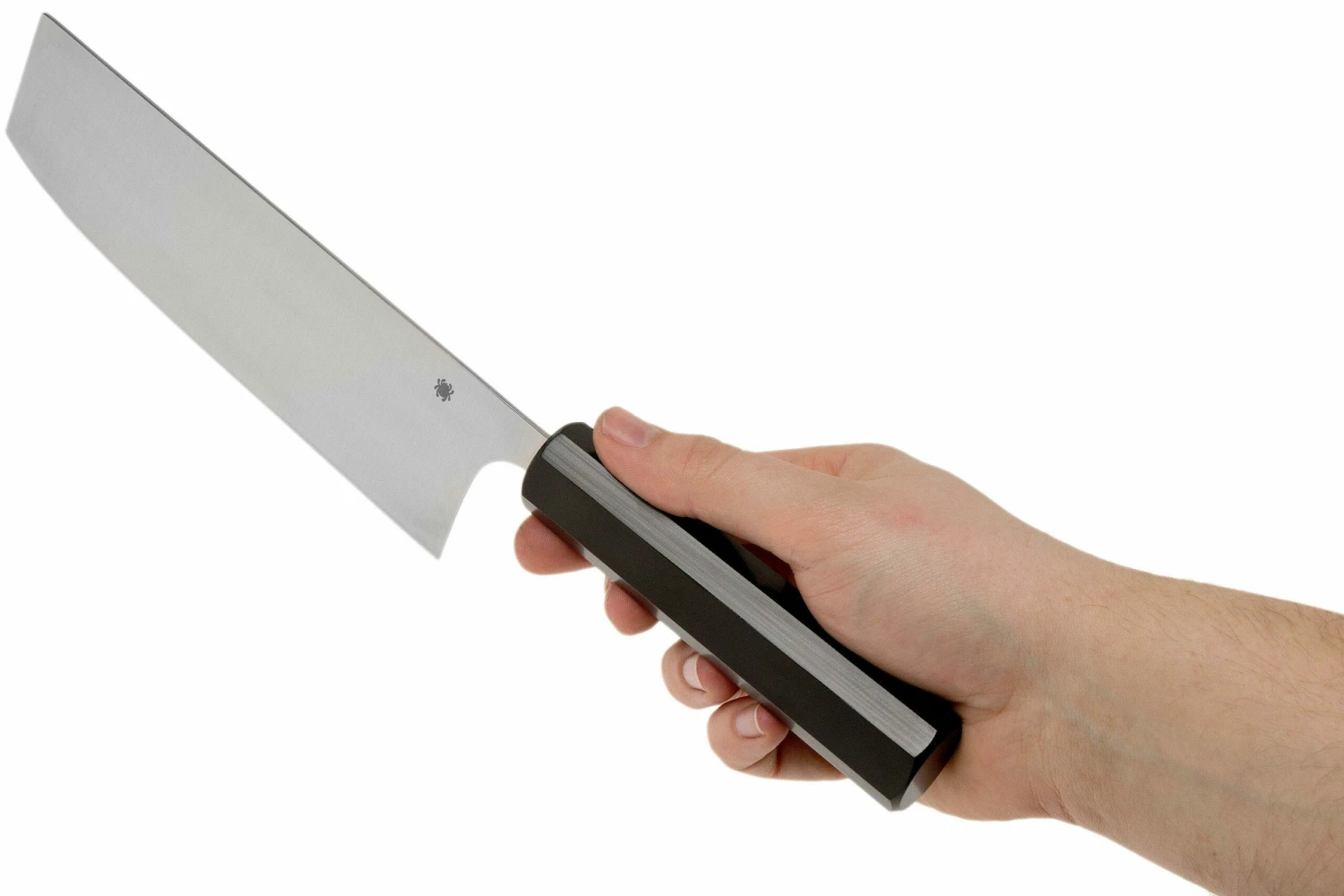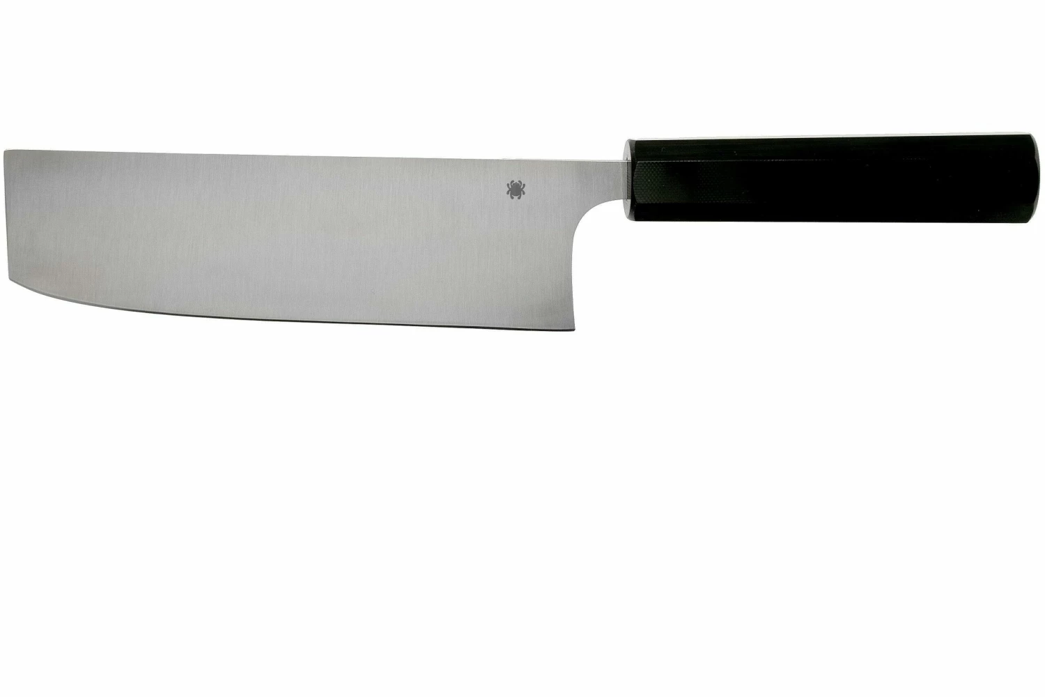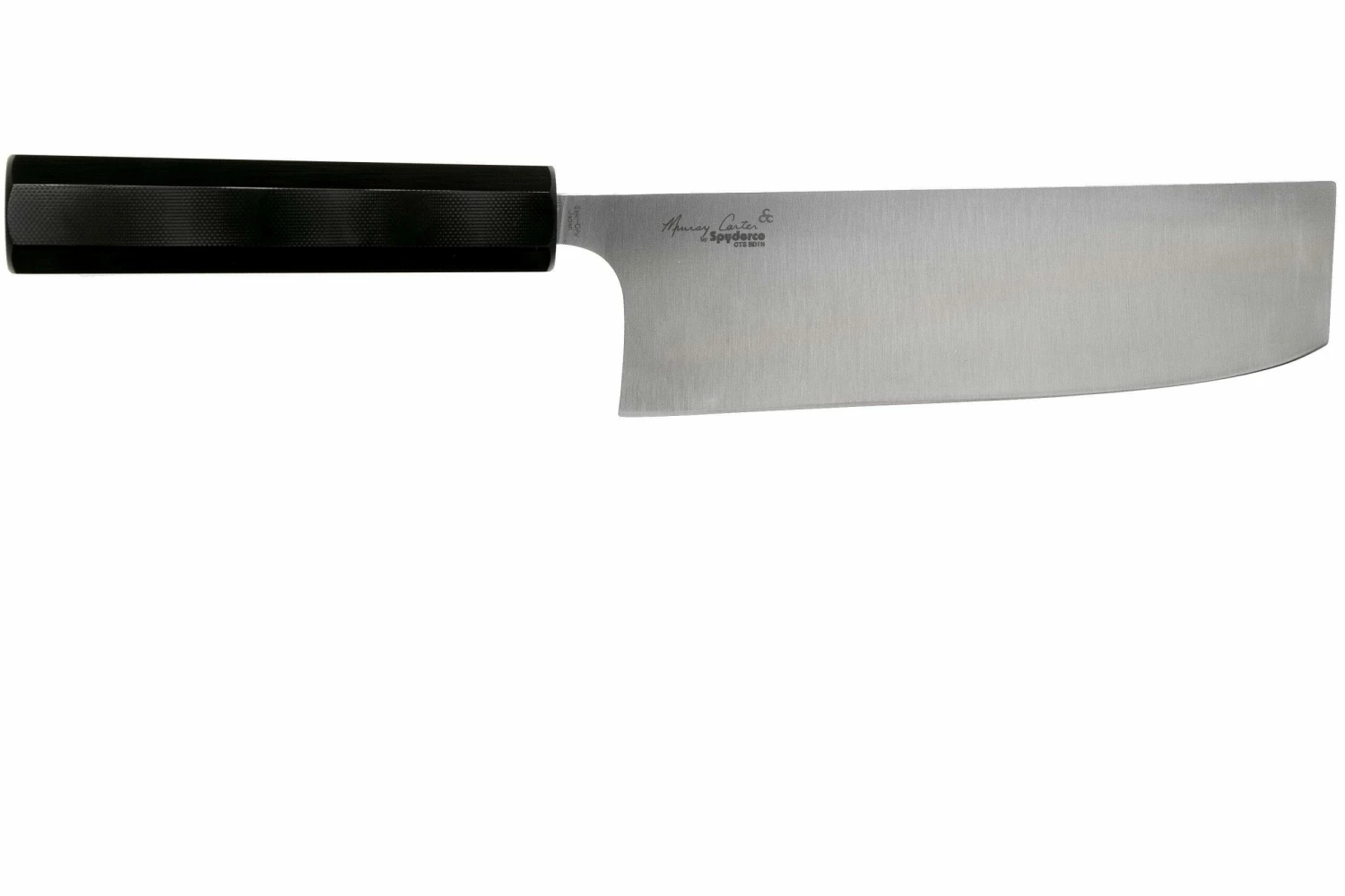 Das Spyderco Nakiri Messer der Murray Carter Wakiita Collection ist atemberaubend schön. Nakiri bedeutet „Gemüseschneider“. Dank seiner einzigartigen, rechteckigen Form ist dieses Messer bestens zum präzisen Schneiden von Gemüse geeignet. Die Spitze des Messers ist leicht abgerundet, sodass Du Gemüse sehr schnell schneiden kannst. Auch das feine Schneiden von Kräutern ist kein Problem.